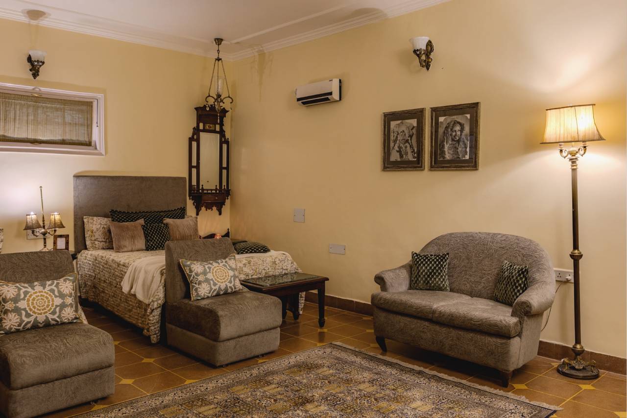 Our Sahib Singh Suites span across odd 900 square feet of love and comfort. They are spacious suites, overlooking the courtyard with relaxing outdoor seating, some can even accommodate triple or quadruple occupancy. Each one enjoys a separate sitting and bedroom space each with its own unique character, design and style. The washrooms have a tub and separate shower.